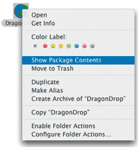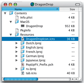 В Mac OS X то, что внешне, из графического интерфейса Finder, выглядит как файл, на самом деле вполне может оказаться целым набором вложенных каталогов — так называемым пакетом (package). Именно такой пакет со строго определенной структурой представляет собой и любая Cocoa-программа. Чтобы увидеть, что же скрывается за значком DragonDrop, воспользуемся командой Show Package Contents («Показать содержимое пакета») контекстного меню.