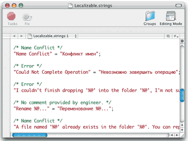 Гораздо более важен и требует существенных затрат времени второй текстовый файл — Localizable.strings. В нем хранятся все строки, используемые программой для вывода разнообразных сообщений, построения «на лету» меню и других элементов интерфейса. Откроем его.