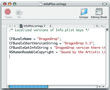 Переводить эти строки или нет — решать локализатору. Обычно ограничиваются минимумом: по-русски пишут слово «версия» и, если нужно, приводят к принятой в России форме информацию об авторском праве. (Строку CFBundleShortVersionString в соответствии с указаниями Apple нужно оставить такой же, как в английской версии, либо вообще удалить.)
