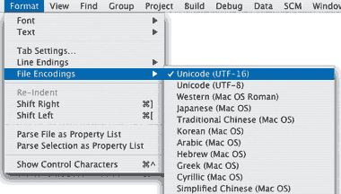 Важное замечание: для корректной работы с языками, использующими алфавиты, отличные от латинского, файл Localizable. strings должен быть сохранен в кодировке Unicode (UTF-16). В редакторе Xcode ее можно установить, воспользовавшись меню Format?File Encodings.