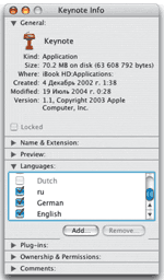 Одна из причин, ограничивающих применение компьютеров Apple в России, — малое число программ с русским интерфейсом. Профессионалы издательского дела этого практически не ощущают, поскольку предпочитают нелокализованные версии. А вот большинство пользователей домашних и школьных компьютеров хотели бы общаться с ними на родном языке. Между тем Mac OS еще в «классические» времена была весьма неплохо приспособлена как для работы с различными языками вообще, так и для локализации в частности. Так что сделать русскую версию приложения (если автор учел рекомендации Apple) было ненамного сложнее, чем перевести текст1. Некоторые программы даже предоставляли возможность выбора языка интерфейса. В Mac OS X же для этого появился стандартный системный механизм SBML2. Открыв паспорт приложения, мы зачастую видим целый список языков. К сожалению, русский (Russian или ru) в нем пока встречается не так часто, как хотелось бы. Что же делать?