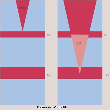 Схема облучения двухслойного диска. Слева: на верхний слой (L0) падает 100% излучения Справа: на нижний слой (L1) проходит ровно половина |