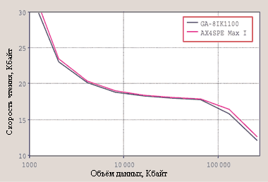 Скорость последовательного доступа у этих плат практически одинакова. А вот при произвольном доступе плата AOPEN показала чуть более высокий результат при работе с основным объемом памяти.