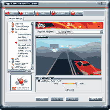 Специалисты ATI анализируют загружаемые текстуры конкретных игр и определяют лучшие методы их визуализации. Результаты работы экспертов выливаются в два режима функции CATALYST AI: Standard и Advanced, использующие разные алгоритмы оптимизации. Как можно догадаться, вариант Advanced требует больше вычислительных ресурсов системы, и, применив его, вы рискуете «перегрузить» медленные компьютеры и получить вместо роста производительности ее падение.