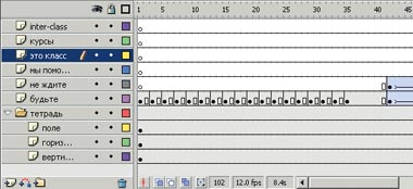 Объясняю смысл содеянного. Как следует из самого названия «покадровая анимация», каждый кадр фильма создается вручную, что мы благополучно и проделали. Для того чтобы немного продлить удовольствие от просмотра появляющихся букв, мы создавали ключевые кадры через фрейм. Следовательно, если вы захотите еще удлинить процедуру вывода слова, то нужно пропускать не один кадр, а больше, а если пожелаете укоротить - не пропускать ни одного.