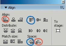 Рис. 2. Выбор параметров выравнивания на панели Align (Выровнять) - При нажатии на кнопку слева внизу панели Timeline (Монтажный стол) появляется новый слой, который мы тут же переименовываем в «горизонт_линии».