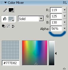- Для оживления клипа по фону пустим созвучную с названием курсов надпись: «Это класс!» Напишите данный лозунг, настройте его размеры на панели Properties (Свойства) и, используя панель Color Mix (Цветовой микшер), установите значение 56 в поле Alpha (Прозрачность), как показано на рис 6.