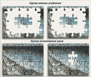 Щелкните на ней и переместите мышь к одному из фрагментов головоломки (рис. 4). Если курсор окажется поблизости от границы стыка двух кусков, то щелчок мышью заменит либо выпуклость куска на впадину, либо наоборот (рис. 4, вверху). Если нажать в центре куска, то он исчезнет, а повторный щелчок вернет его на место (рис. 4, внизу). Такие возможности открывают широкий простор для творчества.