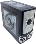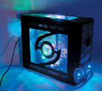 Отделанный высококачественной сталью с серебряным покрытием, этот корпус содержит в себе все технологические преимущества Tsunami и даже больше. Например, нас удивила ЖК-панель с точным отображением температуры внутри системного блока. А светопроводящие вставки с яркими голубыми светодиодами по всей поверхности и даже по опорным «ластам» (выдвигающиеся ножки опоры) создают подобие эдакого «космического существа». Да и светодиоды-индикаторы Power и HDD усиливают общее впечатление. Кроме того, на передней панели есть механический регулятор скорости вращения всех вентиляторов системы.