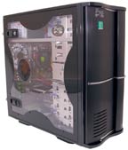 Если вас мучает ностальгия по уходящим в прошлое сереньким офисным коробкам, стоит обратить внимание на корпус фирмы InWin. Его плавные линии не вызывают негативных эмоций, а изящная щель для 3,5-дюймовой дискеты притягивает взгляд. Не забыт и вывод двух USB-портов на лицевую панель. Боковые стенки пристегиваются к каркасу с помощью специальных защелок, обеспечивающих надежность крепления. На одной из них имеется отверстие для забора свежего воздуха, столь необходимого разгоряченным внутренностям ПК, а для создания дополнительного охлаждения предусмотрена возможность установки двух дополнительных вентиляторов. Все кромки аккуратно завальцованы, но, увы, для работы с этой моделью придется вооружиться отверткой. Отсек жестких дисков для удобства установки выполнен съемным, а для 3,5-дюймовых дисководов предусмотрены салазки. Словом, все просто и со вкусом.
