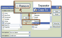 Системы Windows 2000, Me и XP дают и другие возможности сокращения и «прореживания» панелей инструментов. Щелкните правой кнопкой мыши на панели обычных кнопок и выберите опцию «Настройка». Чтобы «проредить» панель инструментов, выделяйте в правом столбце ненужные вам команды и щелкайте на кнопке «Удалить» (рис. 1). Разрешается также реорганизовывать кнопки на панели инструментов, перетаскивая их или нажимая клавиши «Вверх» и «Вниз», чтобы сдвинуть направо те кнопки, которые вы используете реже. Там они скроются за знаком двойного шеврона и останутся доступными.