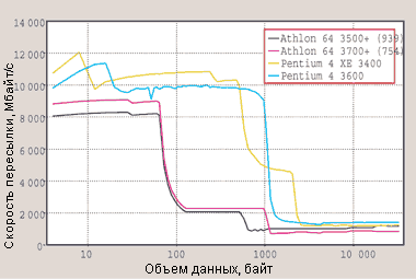 При последовательном доступе к памяти процессор, использующий Socket-939, практически поддерживает паритет с Socket-940 и заметно превосходит Socket-754, работающий с одноканальной памятью. Наблюдается также некоторое отставание от Intel, наиболее ярко проявляющееся при количестве данных больше объема кэш-памяти первого уровня и меньше второго. Это связано с особенностями организации кэш-памяти в процессорах Intel и AMD. У Intel объем кэш-памяти первого уровня целиком поглощается кэш-памятью второго, т.е. все, что содержится в L1, одновременно содержится и в L2. У AMD же уровни кэш-памяти более независимы, в результате чего ее полный объем равен сумме объемов L1 и L2, а не L2, как у Intel. Но это имеет и свои недостатки. У Intel начиная с Pentium III в несколько раз увеличена ширина шины данных между разными уровнями кэш-памяти, поэтому при чтении процессором из L2 фактически воспринимается только первое 64-разрядное слово. Одновременно с этим последующие переносятся в L1 по широкой шине данных и затем читаются процессором уже из L1, а не из L2. У AMD процессор читает сразу из L2, и эти данные в L1 не дублируются, поэтому чтение второй и последующих 64-разрядных порций данных осуществляется также из L2, т.е. с более низкой скоростью. Поэтому при последовательном обмене процессоры Intel работают эффективнее.