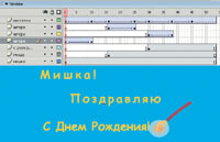 Сейчас мы начнем работать с открыткой, а закончим ее на следующем уроке. Откройте файл на диске Happy_B.swf и посмотрите, что вам предлагается сделать. Совсем не обязательно, чтобы открытка, которую вы будете создавать, была точно такой же, как у меня. Это и ни к чему, ведь нужно делать поздравление, думая о том, кому оно адресуется.