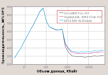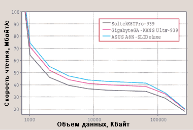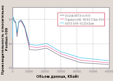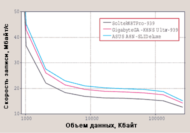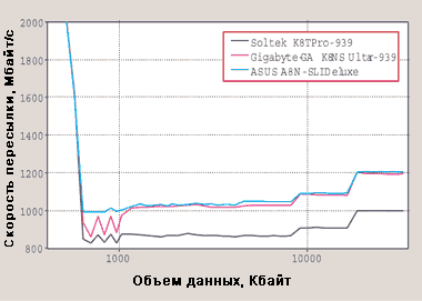 Тестовый стенд состоял из центрального процессора AMD Athlon 64 3500+, 512-Мбайт ОЗУ типа DDR Kingston PC3200, 200-Гбайт жесткого диска Western Digital SATA 150, 48Х-дисковода CD-ROM Lite On LTN483L и 400-Вт блока питания VT-420LD. Все испытания проходили под управлением ОС Windows XP SP1. При тестировании моделей Soltek Get Pro K8TPro-939 и Gigabyte GA-K8NS Ultra-939 использовалась видеоплата ASUS GeForce FX 5600 Ultra, а для ASUS A8N-SLI Deluxe применялась Albatron GeForce PCX FX 5750.