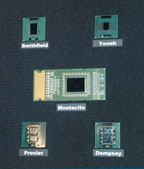 Семейство Itanium также получит свой двухъядерный процессор уже в четвертом квартале этого года. Сейчас он известен под кодовым названием Montecito и знаменит тем, что будет иметь 1,72 млрд. транзисторов. Из характеристик отметим 24-Мбайт кэш, коррекцию ошибок в нем, поддержку технологий виртуализации ресурсов, усовершенствованное энергосбережение, 90-нм техпроцесс. Интересно, что здесь компоненты ядер более перемешаны, в отличие от Smithfield, внутри опять-таки единой упаковки.
