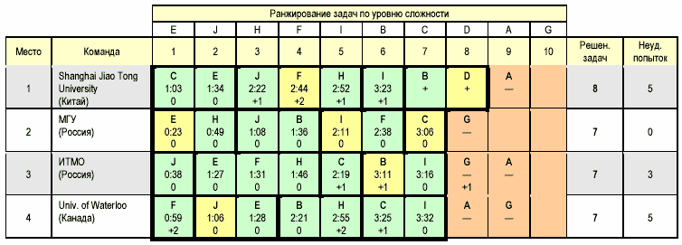 Примечание. Для каждой задачи приведено время успешной сдачи (часы и минуты финала), а также число неудачных попыток сдачи. Красным выделены нерешенные задачи, зеленым - успешно сданные, желтым — те задачи, относительный номер сдачи которых совпадает с ранжированием по уровню сложности, т. е. говорит о точности попадания в ритм от простого к сложному. Жирными прямоугольниками выделены часовые зоны.