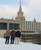 | Павел Наливайко, Петр Митричев и Владимир Рычев у здания Московского Университета перед отъездом команды МГУ в Шанхай |