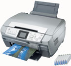 Компания Epson представила на «Фотофоруме» новое многофункциональное устройство (МФУ) Stylus Photo RX700. Его особенностью является собственная печатная система, построенная на базе 6-цветного печатающего механизма, применяемого в струйном принтере R300, но модернизированного для работы с каплями объемом 1,5 пкл, что должно улучшить качество фотографических отпечатков. Картриджи также используются новые — несовместимые с чернильными емкостями для R300. Из особенностей МФУ отмечу возможность сканирования фотопленки и иных прозрачных носителей благодаря встроенной в крышку лампе подсветки.