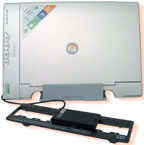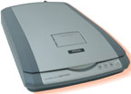 Устройство от HP впечатляет размерами — не на каждом рабочем столе хватит места для подобного монстра. Основное предназначение этого сканера — работа с фотоматериалами, для чего в верхнюю крышку встроена специальная дверца с расположенной в ней лампой подсветки. Под дверцей находятся крепления для прозрачных материалов и фотографий. На наш взгляд, такая система более удобна, чем привычная с рамками. Увы, за комфорт придется платить. В крепления можно установить одновременно лишь две полоски пленки или четыре слайда в рамках, при этом сканироваться будут только два первых кадра. Кроме того, для ускорения сканирования в держатель можно загрузить до 12 фотографий. Вся верхняя крышка снимается, благодаря чему можно работать с толстыми оригиналами. Не хватает только разметки по бокам предметного стекла. На передней панели удобно размещены дополнительные кнопки, обеспечивающие, помимо привычных уже функций сканирования в графический файл или документ, еще и возможность работы со слайдами или негативами, а также копирования на подключенный к системе принтер.