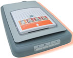 Данный аппарат, в отличие от других, представленных в обзоре, выполнен на базе технологии CIS (контактный датчик изображения, в дальнейшем КДИ). Матрица фотодиодов располагается по всей ширине сканируемой области под защитным стеклом и воспринимает свет, отраженный от оригинала. Следствием использования такой технологии стало серьезное изменение многих параметров устройства. Так, толщина сканера составляет всего 35 мм, ему не требуется внешний адаптер питания — вполне достаточно пяти вольт, получаемых от разъема USB. Устройство допускает сканирование даже в вертикальном положении, для чего имеется встроенная подставка. А чтобы оригиналы плотнее прилегали к стеклу, крышка снабжена маленькими магнитами.