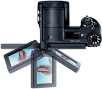 Запутаться в органах управления практически невозможно. На верхней части аппарата расположены диск выбора режимов работы, кнопка включения/выключения камеры и кнопка спуска затвора, обрамленная кольцом с выступом, служащим регулятором зума. На левой боковой части объектива находятся две кнопки: кнопка переключения режимов фокусировки (автоматический, ручной, макро) и кнопка вызова основных параметров съемки (светочувствительность, баланс белого, разрешение снимков и т.д.). Практически всю заднюю стенку фотокамеры занимает двухдюймовый экран. Он может поворачиваться на 180o по горизонтали и на 270o по вертикали, позволяя, таким образом, снимать практически из любого положения. Справа от экрана находятся основные кнопки управления при работе с меню: джойстик в форме кольца со стрелками и вписанной в центр кнопкой ОК.
