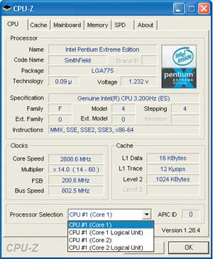 Но недоработка справочной функции процессора встречается не только у изделия AMD. Так, процессор Intel сообщает о себе как об обычном, уже слегка устаревшем 3,2-ГГц процессоре без всяких указаний на двухъядерность или принадлежность к элитному семейству Extreme Edition. Из рассматриваемых моделей только у AMD Athlon 64 FX-55 в этом отношении все в порядке.