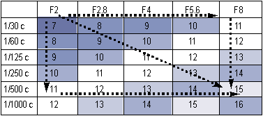 | Типовая таблица освещенности, на основании которой автоматика камеры устанавливает выдержку/диафрагму |
