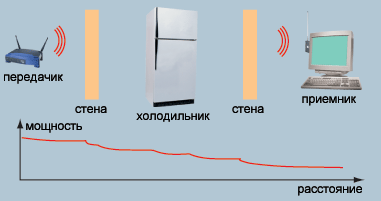 Наиболее распространено оборудование совместимых стандартов IEEE 802.11b и 802.11g. Оба стандарта работают в полосе частот 2,4 ГГц, допуская выбор из нескольких частотных каналов наиболее благоприятного. Радиосигналы устойчиво ловятся на расстоянии до 400 м при прямой видимости и до 100 м в здании. Как и для радиотелефонов, железобетонные стены не являются для них непроходимыми, но любое преодолеваемое сигналом препятствие снижает его мощность. Не мешают, но ослабляют сигнал любые стены, двери, холодильники и стиральные машины, микроволновые печи, находящиеся между передатчиком и приемником (рис. 4). Улучшить качество сигнала могут дополнительные антенны, если ваше оборудование допускает их подключение. А если сигнал слабее, если ниже отношение сигнала к шуму, значит, ниже скорость.