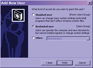 Вы можете встать на пути у программ-шпионов, пользуясь ограниченной учетной записью, лимитирующей вашу (и злонамеренной программы) способность изменять систему и устанавливать всякие приложения. Для этого выберите «Пуск?Панель управления» и откройте «Учетные записи пользователей». Щелкните на позиции «Создание учетной записи», введите имя для новой учетной записи и щелкните на кнопке «Далее». Укажите вариант «Ограниченная запись», щелкните на позиции «Создать учетную запись» — и новая учетная запись появится в окне «Учетные записи пользователей» под надписью «или выберите изменяемую учетную запись». Щелкните на новой записи и внесите в нее любые нужные вам изменения. После этого входите в Windows XP для повседневных путешествий по Интернету или редактирования документов, используя эту новосозданную запись, а когда вам понадобится установить какую-либо программу, просто выйдите из системы и снова войдите в нее как администратор. Не забудьте удостовериться также в том, что учетная запись гостя у вас отключена (Windows должна делать это по умолчанию).