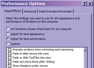 Взбодрить ПК можно, отключив имеющиеся в Windows XP экранные красоты — например, всякого рода анимационные элементы меню и другие визуальные эффекты. Щелкните для этого правой кнопкой мыши на значке «Мой компьютер», выберите «Свойства», откройте закладку «Дополнительно» и в разделе «Быстродействие» нажмите кнопку «Параметры». На закладке «Визуальные эффекты» диалогового окна «Параметры производительности» укажите вариант «Обеспечить наилучшее быстродействие» или поэкспериментируйте самостоятельно, отключая различные анимационные и визуальные эффекты в прокручивающемся ниже списке.
