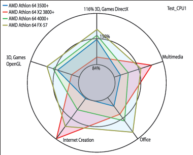 По результатам теста SYSmark 2004 в офисных приложениях места распределились в полном соответствии с присвоенными процессорам рейтингами, а вот в профессиональных приложениях из группы Internet Content Creation вперед вырвался двухъядерный 3800+, обойдя даже FX-57, и по суммарному результату он занял второе место, обогнав 4000+.
