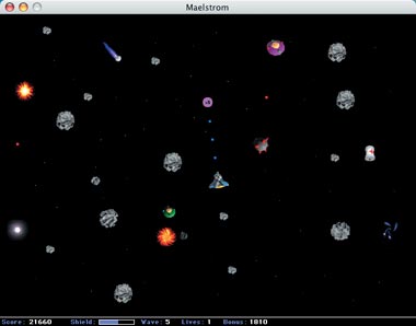 Эта игра со временем претерпевала изменеия, поскольку не раз переписывалась. Однако ее идея осталась прежней. В Maelstrom необходимо перемещать по экрану космический корабль, внешне напоминающий «Шаттл», уворачиваться от громадных каменнных глыб и расстреливать их из гиперпушки. Время от времени появляются ящики со вспомогательным оборудованием, пролетают кометы, нападают «чужие», вспыхивают сверхновые звезды, а то и в черную дыру начинает затягивать. Ребенку такая игра понравилась сразу, правда, всему он дал свои детские названия. Комета, например, у него называется «болтиком» (по правде говоря, она и в самом деле напоминает болт, летящий шляпкой вперед в окружении синего пламени).