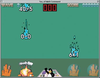 Игра TuxMath предоставит в ваше распоряжение лихого, но глуповатого бойца-пингвина. В его обязанности входит расстрел из лазерной пушки падающих с неба комет-задачек, чтобы они не нанесли непоправимого ущерба ни одному из четырех городов. Как и большинство новобранцев, пингвин в математике не силен, и потому решать примеры типа 2 ? 2 придется вместо него. Причем необходимо в течение 1—2 с сообщить пингвину результат вычислений. Только в этом случае можно рассчитывать на то, что он нажмет нужную кнопку и комета с уравнением будет своевременно уничтожена.