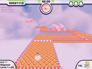 Игра TuxRacer, описанная мной в предыдущей статье, посвященной открытым развлекательным программам («Мир ПК», №10/04, c. 56), нашла свое коммерческое воплощение в игровом автомате, за которым я регулярно наблюдаю в ближайшем торгово-развлекательном комплексе. Разработчики условно-бесплатного ПО из Mumbo-Jumbo также не стали изобретать велосипед — они продают значительно улучшенную версию NeverBall под названием Snowball Run. Программисты взяли за основу механизм и набор уровней этой игры, но полностью переработали идею и графику, лишь слегка изменив принцип управления. Они поставили пингвина на снежный ком, и отныне его кармическая задача — катить шар к финишу и кушать по пути рыбу. Теперь не нужно наклонять плоскость, чтобы шар покатился, силу тяжести будет использовать маленький любитель вяленой рыбы. Следовательно, и вид будет изменяться теперь лишь в одной плоскости. В общем, физика в Snowball Run осталась та же, что и в NeverBall, но выглядит эта игра веселее и красивее, к тому же яркую динамичную графику сопровождает бодрый цирковой марш. Все вместе создает атмосферу праздника, и вполне естественно, что ребенку очень нравится такая игра.