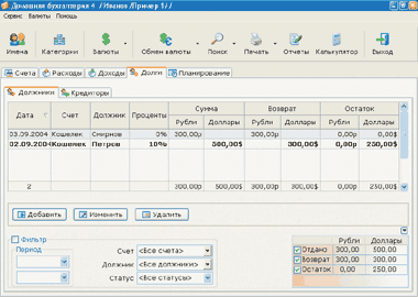 Специально предусмотренная система работы с долгами позволяет учитывать все свои кредиты: при желании «Домашняя бухгалтерия» будет вычислять долговые проценты, контролировать их возврат и своевременно напоминать о долге, который скоро следует вернуть.