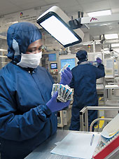 Прежде чем попасть в цеха, пришлось переодеться в хлопковые «скафандры» и принять воздушный душ, дабы очиститься от пыли, которую мы могли пронести с собой. Ведь чем чище чернила, тем длиннее срок жизни печатающей головки, что является основным аргументом производителей печатающих устройств, призывающих покупать оригинальные расходные материалы. Так что в помещениях царит идеальная чистота. Полы просто сверкают — видимо, большой штат уборщиков действительно трудится в стенах фабрики не покладая рук.