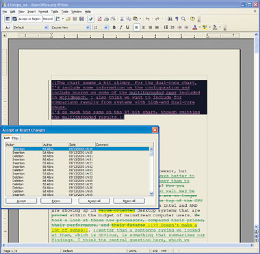 Иногда OpenOffice порывается предоставить в ваше распоряжение больше информации, чем нужно. Это сбивает с толку. Если, к примеру, ваш документ имеет множество изменений, сделанных в режиме правки, то обработка этих правок становится делом весьма занудным. В программе Microsoft Word, щелкнув правой кнопкой мыши на исправленном фрагменте, можно принять или отклонить данную правку. Программа Writer, эквивалент Word в OpenOffice, выдает в таких случаях диалоговое окно с перечнем всех правок и сведениями о том, кто их внес и когда. Для принятия или отклонения изменений вы должны все время сверять документ с этим списком, рискуя заработать косоглазие.