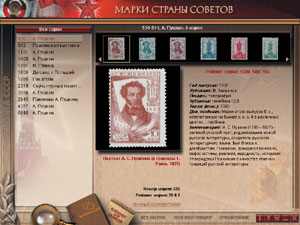 Вероятно, вспомнив о том славном времени, когда людей интересовало не только колебание курса у.е., студия Com.Media создала диск «Марки Страны Советов». Филателисты, коих, думается, не постигла участь динозавров, несомненно, оценят сие издание, в основу которого положен каталог-справочник В. Соловьева «Почтовые марки России и СССР (1857—1991 гг.)». (Для еще не посвященных: этот каталог успел отметиться на ряде выставок, в том числе зарубежных.)