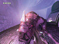 Замечу, что даже если вы убьете охранника, то лишь изредка сможете пользоваться его оружием, поскольку оно «умное» и слушается лишь хозяина, идентифицируя его по ДНК. Точнее, оружие подчиняется любому человеку, чья цепочка ДНК числится в главном компьютере тюрьмы. Естественно, получив доступ к этому устройству, можно «залить» в него свою ДНК и... Однако добраться до мейнфрейма не так легко, и потому придется и хитрить, и вступать в рукопашный бой. В большинстве случаев удается избежать открытой схватки с охранниками. Лучше подкрасться к противнику сзади и свернуть ему шею. Чтобы «осторожно подобраться», в арсенале игрока имеется стелс-режим, будучи в котором Риддик способен контролировать вероятность обнаружения охраной. Физически это выглядит так: если опасность далеко, то все объекты на экране имеют синеватый оттенок, словно они видны через синее стекло, но когда кто-то приближается, то краски начинают проявляться и вы слышите стук сердца жертвы. По мере продвижения по сюжету помимо столь замечательных рефлексов Риддик получает также возможность видеть в темноте. Кроме того, наш герой обладает способностью к регенерации. Правда, здесь есть некоторые ограничения. Уровень здоровья персонажа поделен на равные доли (в начале игры их четыре), и лишь частично поврежденная часть регенерирует, т.е. если вы потеряли 1,5 единицы здоровья, то восстановится 0,5, а остальное можно будет поправить посредством специальной медицинской станции NanoMed.