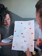 Процесс выкупа обычно заключается в выполнении женихом ряда заданий. Например, найти отпечаток губ невесты на бумаге (рис. 2). Также от него могут потребовать нарисовать портрет невесты (рис. 3). Как правило, все это происходит либо в подъезде на лестнице (если невеста живет в многоквартирном доме), либо непосредственно на подходах к дому. Ваша задача — запечатлеть процесс. Если вы идете на свадьбу в первый раз, а на нее приглашен также оператор, то старайтесь не отставать и быть всегда рядом с ним. Это позволит правильно найти позиции, поскольку в целом выбор наиболее удачного ракурса для видео- и фотосъемки совпадает. При выкупе сразу займите передовые позиции (т.е. впереди всех) и придерживайтесь их по мере продвижения, что позволит вам не пропустить самые интересные моменты, а если сие действие происходит на лестнице, то вы сможете снимать сверху, что расширит поле для сюжетных маневров. Снимайте все, что покажется вам интересным: выражения лиц жениха и гостей, конкурсы. Не забудьте захватить запасной комплект аккумуляторов, поскольку при интенсивной съемке одного комплекта может не хватить.