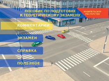 Перед нами интерактивный DVD-диск студии «Новый Диск» «Пособие по подготовке к теоретическому экзамену на право управления транспортными средствами категории «А» и «В». При наблюдаемом в последнее время ажиотаже вокруг изменений в содержании Правил дорожного движения данный мультимедийный продукт вызывает особенный интерес. Вставляем его в дисковод компьютера или привод DVD-проигрывателя, и после коротенькой рекламной заставки перед нашим взором предстает оживленный нерегулируемый перекресток, а в колонках раздается такой знакомый шум множества шин (протяженность анимированного видеоролика всего 17 с, затем он снова и снова повторяется). Видим следующие пункты меню (сверху вниз): «Комментарии», «Экзамен», «Справка», «Полезное». Куда бы вам хотелось войти в первую очередь?