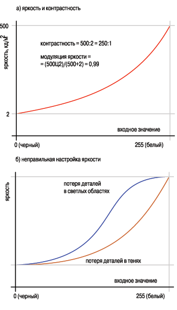Настройка яркости и контрастности применительно к ЭЛТ-мониторам означает установку минимальной и максимальной интенсивности создаваемого светового потока (рис. 3). Регулятор яркости следует устанавливать на минимальное значение, еще позволяющее различить детали в тенях, а регулятор контрастности — на максимальное, при котором светлые тона достаточно яркие, не сливаются и комфортны для глаз. Калибровочное программное обеспечение выводит на экран соответствующие изображения, чтобы можно было оценить правильность регулировок зрительным или инструментальным способом. Если говорить о числах, то для ЭЛТ рекомендуется яркость белого 85—100 нит, для ЖК — 100—150 нит.