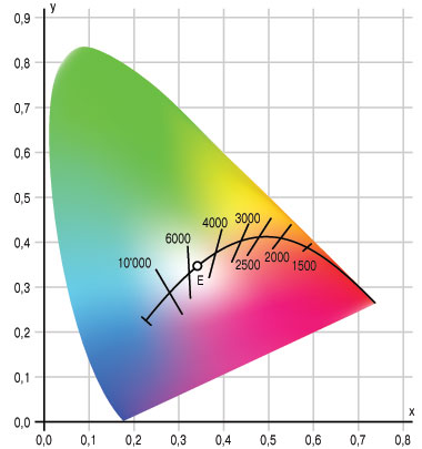 Итак, разновидностей цветных рецепторов всего три, а число распознаваемых тренированным глазом цветовых тонов превышает полторы сотни. Оказалось, что визуально могут восприниматься одинаковыми цвета излучений разного спектрального состава — эффект метамерности. С уменьшением насыщенности и яркости метамерия усиливается; наибольший эффект характерен для белых цветов, поэтому нельзя четко определить «единственно правильный» белый цвет экрана. Обычно цветовой оттенок ахроматического излучения характеризуют цветовой температурой, которая в физике выражается через температуру идеального излучателя, называемого абсолютно черным телом (рис. 1). Свет с равномерным распределением спектральной плотности имеет цветовую температуру 5400 К («точка E» — equal energy point), что примерно соответствует солнечному свету в летний полдень на средних широтах; диапазон нейтрально воспринимаемых оттенков колеблется от 5000—7500 К в естественных условиях до 6000—9500 К на экране монитора. Наиболее часто используемые в технике значения кратко записываются в виде «D65», где буква D обозначает «дневной свет» (daylight), а число 65 — температуру в сотнях кельвинов (в данном случае точное значение 6504 К).
