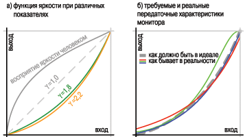 Чего мы хотим добиться в результате характеризации? Нормализация цвета начинается с балансировки белого, потому что меню монитора высокой точности не дает и для ЖК-панели даже не рекомендуется. Затем надо сбалансировать RGB-каналы для серых полутонов, чтобы они на самом деле стали нейтрально-серыми на протяжении всей градационной шкалы. Важно также достичь определенной нелинейности передаточных функций, чтобы компенсировать восприятие яркости глазом: линейный закон y = x приводит к отображению неадекватных, блеклых цветов, поэтому вместо него используют показательный закон y = xγ (рис. 4). В качестве значения параметра γ (гамма) чаще всего применяется 2,2 для Windows и 1,8 для Mac.