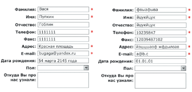 | Рис. 1. Типовые «мусорные» данные при заполнении регистрационных форм с обязательными полями. «Мусор», вводимый для соблюдения приватности (слева), и «мусор», вводимый для экономии времени (справа) |