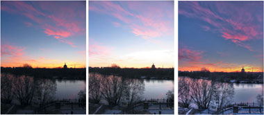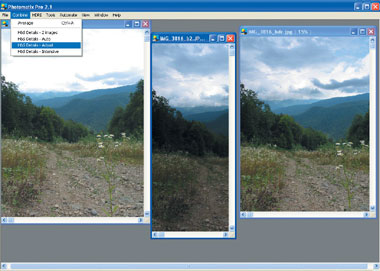| Рис. 2. Создание HDR-изображения в PhotoMatix. Слева направо: снимок с экспозамером по земле, небу, финальное «собранное» изображение |