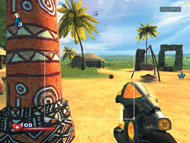 Теперь обратите внимание на грани разных объектов на фрагментах экранных снимков из игры Serious Sam. На краях оружия, столба, пальмы, дома, мячика и синего чебурашки хорошо видны так называемые лесенки. Такие ступенчатые границы объектов образуются при желании отобразить наклонные линии посредством дискретного устройства — монитора, а подобный эффект называется алиасингом (aliasing).