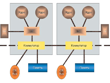 Вернемся к Power4. Каждое из его ядер обладает собственным кэшем первого уровня для данных и инструкций (соответственно LD 1 и LI 1) и общим кэшем второго уровня (L2), управляемым тремя раздельными, автономно работающими контроллерами, которые подключаются к процессорным ядрам через коммутатор (Core Interface Unit, далее CIU). За такт контроллеры могут выдавать до 32 байт данных. Общий кэш для нескольких ядер хорошо сказывается на производительности процессора благодаря более быстрому доступу к совместно используемой информации, однако при таком способе организации велика вероятность возникновения конфликтов, многоступенчатая же организация кэша позволяет использовать его наиболее эффективно.