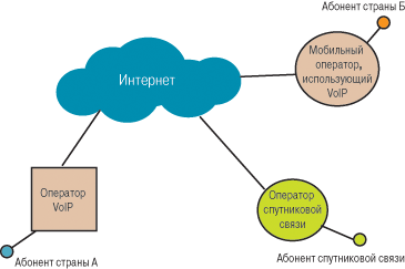 Из схем понятно, что при традиционной телефонии между абонентами существует большое количество посредников (крупных телекоммуникационных компаний). Откуда они берутся? В идеале абонент каждого из операторов связи (фиксированной, мобильной или спутниковой) должен иметь возможность дозвониться любому абоненту в любой стране мира. Однако на практике для этого «нашему» оператору связи необходимо заключить договоры сотрудничества со всеми операторами связи в мире, что невозможно. Оператор обращается к «вышестоящей» организации, которой может быть более развитый оператор в его стране либо крупная транснациональная телекоммуникационная компания. В качестве последней часто выступают крупные операторы связи развитых стран, например DeutscheTelecom (Германия), TelecomItalia (Италия), мобильные операторы, имеющие точки присутствия в большом количестве стран, — Orange, T-mobile, Vodafone, O2, Telenor и др. В качестве связующих средств используются телефонные кабели внутри страны, спутниковая связь, транснациональные многожильные кабели, в том числе подводные, и т.п.