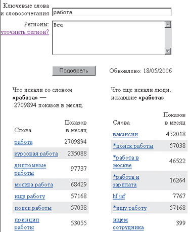 Выход из этой ситуации прост. Первое слово, показываемое в http://direct.yandex.ru, — общее для всех запросов, оно определяет их категорию. Исходя из правил русского языка оно вряд ли может быть лучшим ключевым для вашего сайта по той простой причине, что оно слишком обобщенное. Куда лучше использовать уточняющие фразы с этим словом, например «ищу работу», «предлагаю работу», «надомная работа» и т.п. Как же определить лучшую ключевую фразу? Используя формулу, рассмотренную выше, определите индекс эффективности для каждой фразы и выберите, какая из цифр больше, — та фраза и лучше.